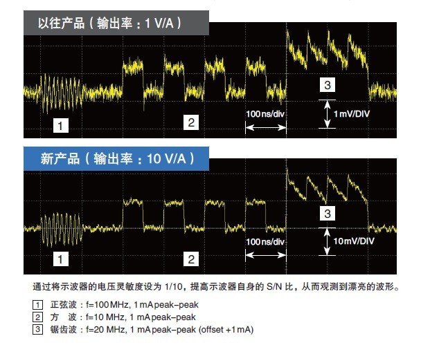 在没有示波器滤波器设置或平均过程的情况下,保留想要查看的波形。 实现10 V / A 10倍于传统输出速率1 V / A,可将示波器的电压灵敏度降低到1/10,提高示波器的S / N比,并可清晰地观察微小电流波形。