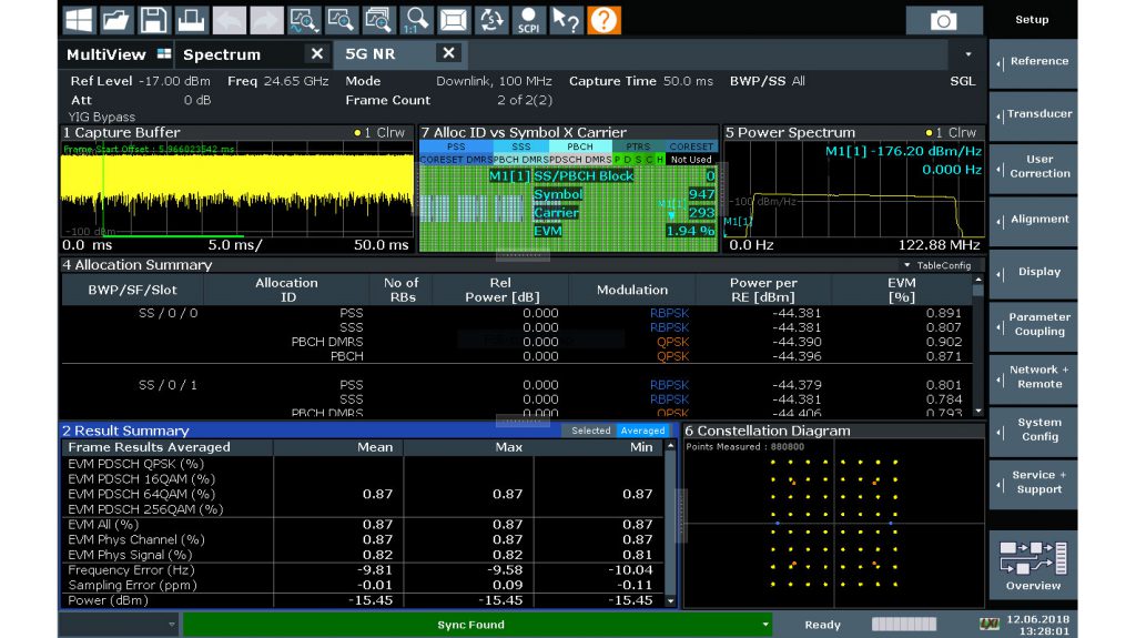 R&S®FSW-K144和R&S®FSW-K145选项包括在下行链路和上行链路中3GPP 5G NR的带内测量。对每个信号子帧进行了分析,给出了各种测量结果,包括不同信道和信号的EVM、频率和功率。